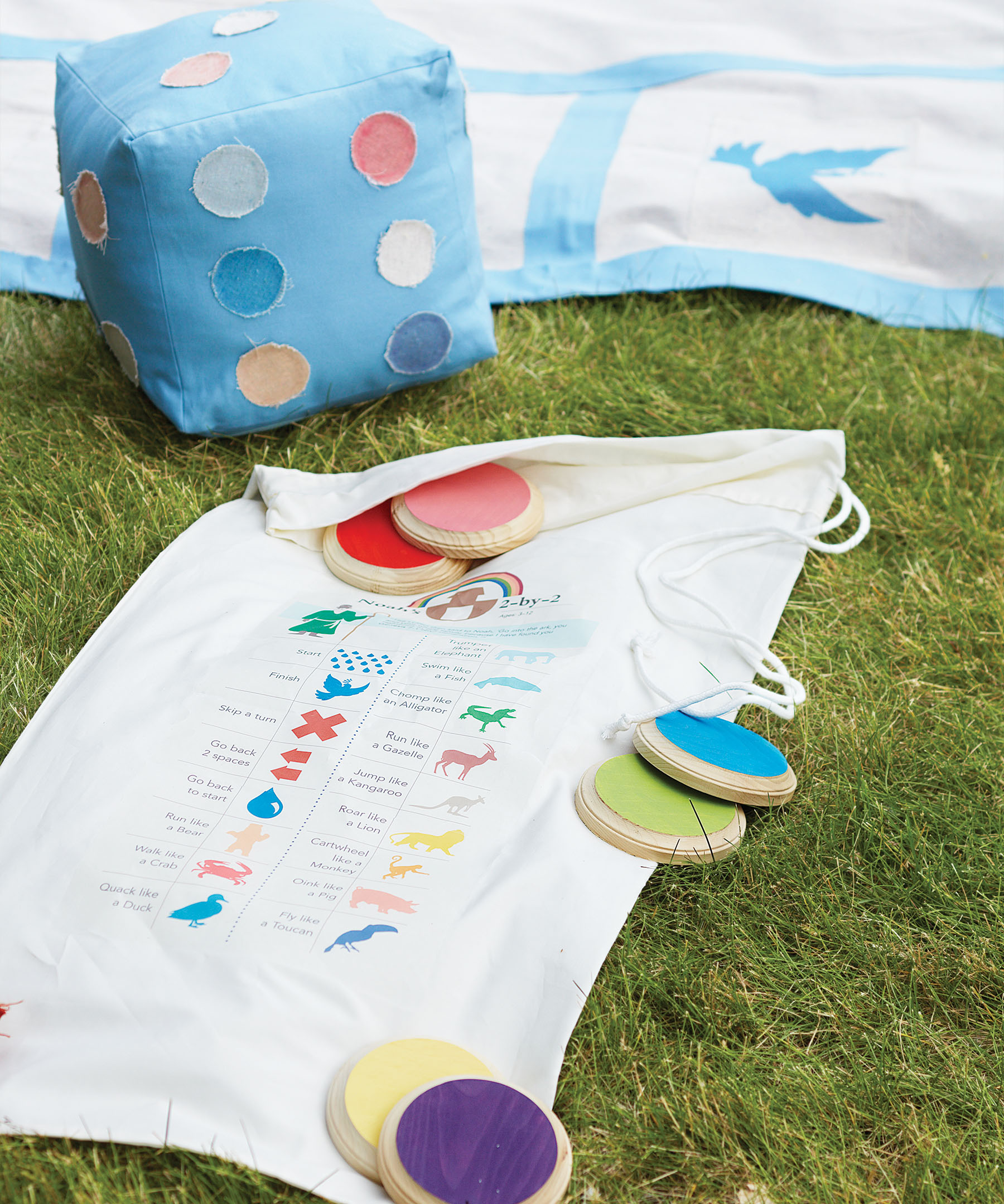 The ark is drawn freehand on the game board and painted with fabric paint. To draw the half-circle bottom of the ark, fashion a compass using a dowel and a piece of string. Wooden craft discs, top right, painted in bright colors serve as placeholders when kids step off the board to follow instructions for their squares. The instructions are displayed in a game key printed on iron-on transfer paper and ironed onto a king-size pillowcase. The template can be downloaded from our website. Slit the pillowcase hem and run a cord through it to create the drawstring. The large die is made from colorful duck cloth, stitched into a cube and stuffed with polyester filling. Dots on the die are made from painter’s cloth using the freezer-paper transfer method and glued in place. Paint them on if you prefer. Store the game board, the large die and placeholders in the pillowcase.