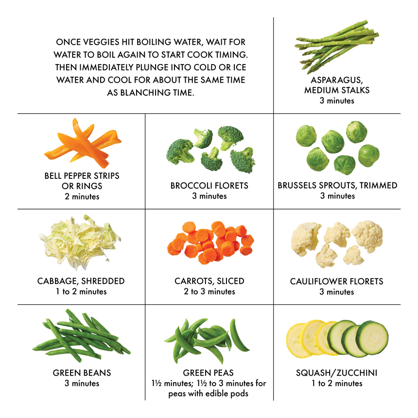 Blanching removes surface dirt and organisms and halts enzyme action that can deteriorate flavor, color, texture and nutrition. It softens produce and brightens its color before canning or freezing. The easiest blanching method is to prep produce—wash, trim, peel, if needed—then add to boiling water and cook just a couple minutes or more from the moment the water starts boiling again. Immediately plunging food into a bowl of ice water stops fibers from softening and brightened pigments from turning dull. Use a slotted spoon to transfer blanched food to the ice bath, then to a dry towel to drain. Or place produce in a wire basket, then into boiling water to blanch. Good veggies to blanch are those that take longer to cook such as green beans, snap peas, broccoli, cauliflower, carrots, artichokes, asparagus and Brussels sprouts.