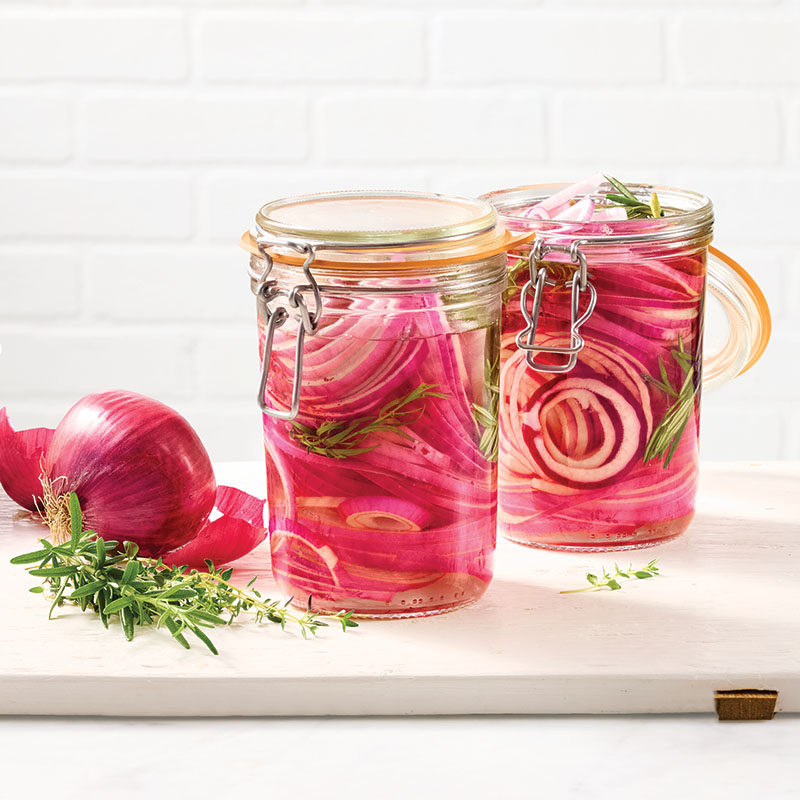 Quick-pickling skips labor-intensive canning steps and allows tangy pickling of smaller batches of vegetables and fruits. Most fresh veggies are tasty candidates for quick refrigerator pickles. Try cucumbers, asparagus, carrots, onions, peppers, green beans, cauliflower, squash and more. Pickled fruits can include pineapple, cherries and watermelon. Basic quick-pickling brine consists of water, vinegar that is at least 5 percent acetic acid, salt and perhaps sugar. Add-ins can include garlic cloves, fresh or dried herbs and whole or ground spices. Pickled vegetables are tangy additions to burgers, banh mi, tacos, nachos, pizza, grilled fish, pasta salads and much more. They also are tasty ingredients for a charcuterie board.