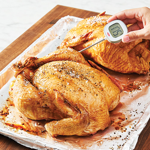 How to Test Temperature: Insert an instant-read thermometer into the center of the thigh and breast, away from bone. Check for an internal reading of 175°F for thigh and 165°F for breast doneness.