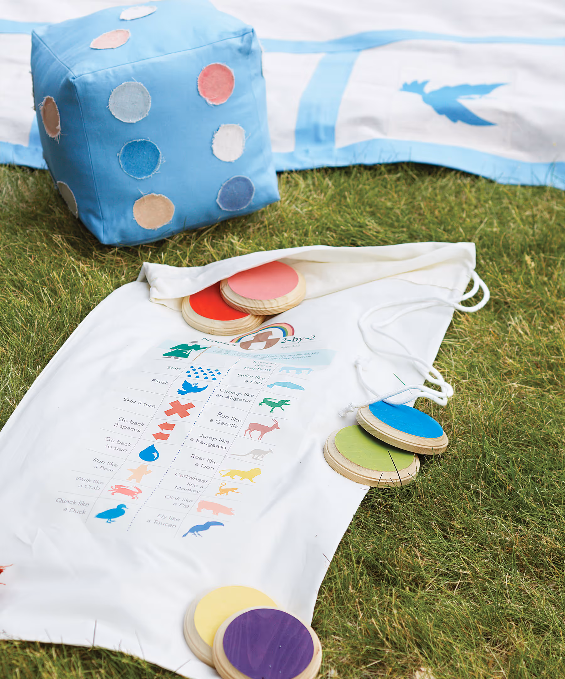 The ark is drawn freehand on the game board and painted with fabric paint. To draw the half-circle bottom of the ark, fashion a compass using a dowel and a piece of string. Wooden craft discs, top right, painted in bright colors serve as placeholders when kids step off the board to follow instructions for their squares. The instructions are displayed in a game key printed on iron-on transfer paper and ironed onto a king-size pillowcase. The template can be downloaded from our website. Slit the pillowcase hem and run a cord through it to create the drawstring. The large die is made from colorful duck cloth, stitched into a cube and stuffed with polyester filling. Dots on the die are made from painter’s cloth using the freezer-paper transfer method and glued in place. Paint them on if you prefer. Store the game board, the large die and placeholders in the pillowcase.