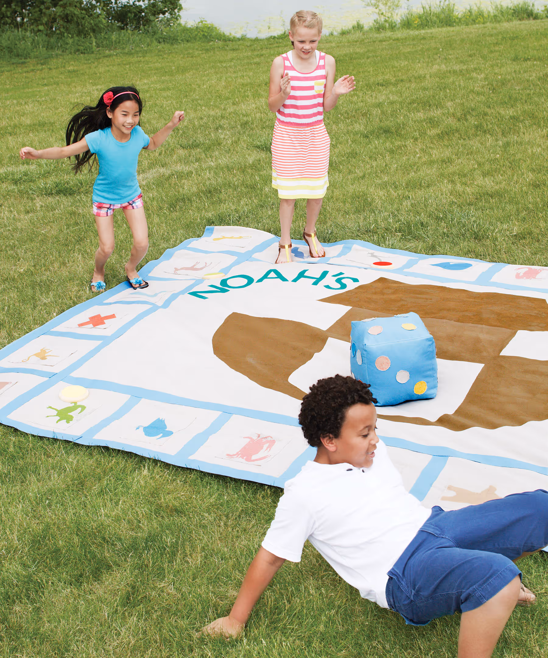 Kids will love becoming the game pieces on this giant game board, opposite, fashioned from painter’s cloth. At every role of a big die, players move to a space and follow the instructions—running like a gazelle, cartwheeling like a monkey, flying like a toucan—until they make it to the finish line, symbolized by a dove.