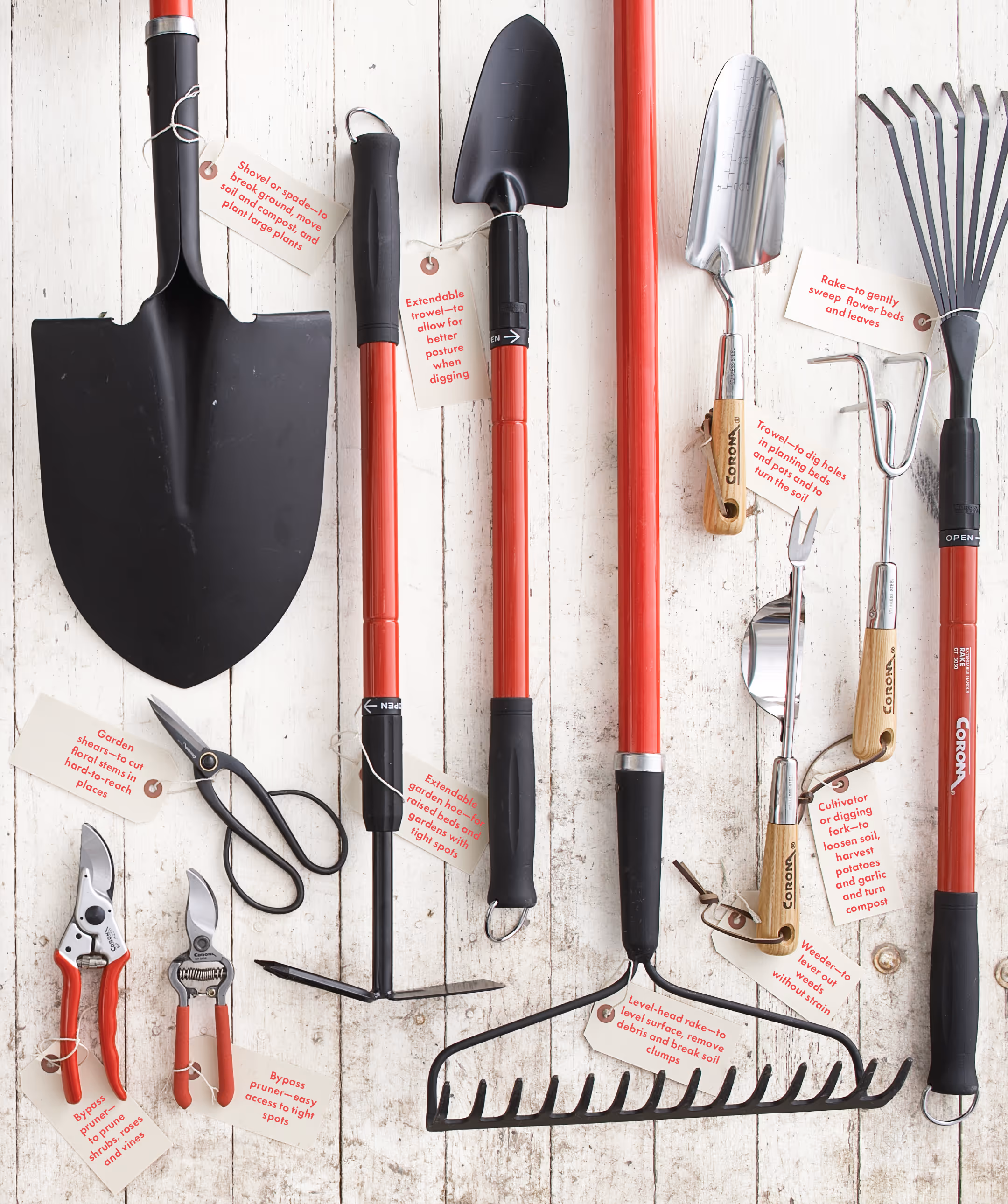 If you’re trying your hand at gardening for the first time, start with inexpensive tools. (See the labels, below, for types of tools you might want to consider.) If you discover gardening is a hobby you’ll pursue, as implements break, replace them with quality ones. Quality tools feature forged-steel tool heads; this means the tools are formed from one continuous piece of steel with few weld marks. Also consider ergonomic tools, which put less strain on joints and transform garden chores into a body-friendly workout. Stainless-steel tools shrug off rust.