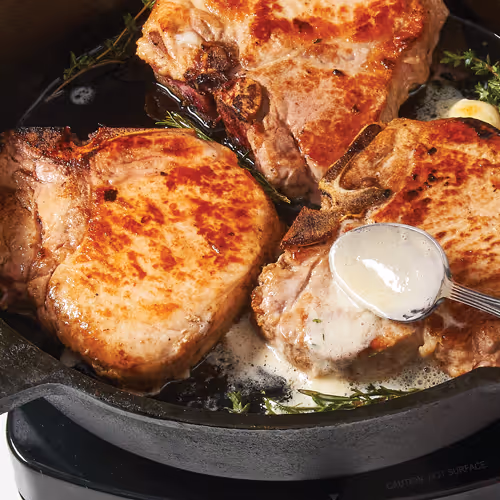 Order pork chops from a butcher; ask for 1- to 2-inch bone-in chops. (The bone protects meat from overcooking and gives it a richer flavor.) Select pinkish-red chops that have some marbling; fat adds flavor and moistness during cooking. Steer clear of chops that have dark-color bones or dark spots on the fat.