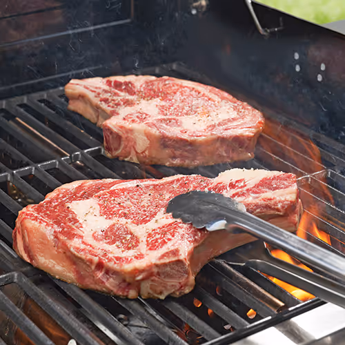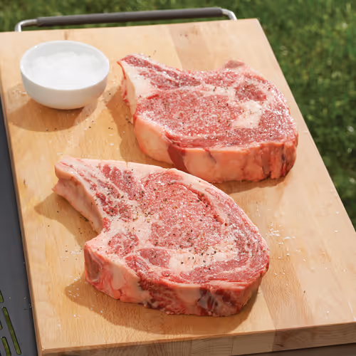 For bone-in ribeyes, the rib bone is usually trimmed flush with the meat. If the bone is left long, the cut is called a tomahawk or cowboy ribeye. The bone adds flavor and moisture. The meat next to the bone cooks more slowly than the edges, so take extra care when grilling.