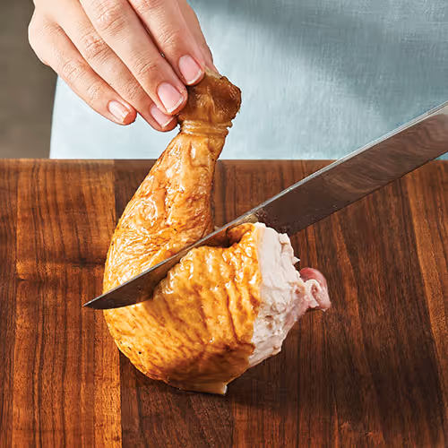 2. Slice along each side of center of breastbone while pulling meat away from bone. Cut or thinly slice into serving-size pieces.