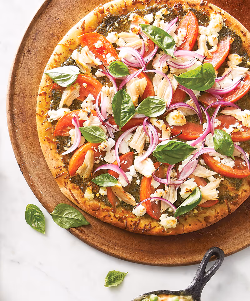 Add pizzazz to pizza with basil pesto, shredded chicken, tomato wedges, red onion slices, basil and goat cheese crumbles. Pizza without tomato sauce never tasted so good!