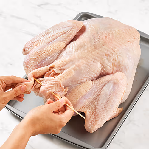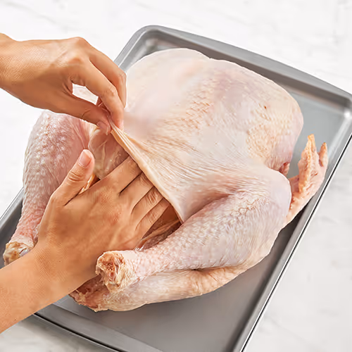Fresh or Frozen? Whole turkeys may be labeled “fresh” only if they have never been chilled below 26°F. Store a fresh turkey in its packaging in the refrigerator. Cook it within 2 days after purchasing. Turkeys chilled below 0°F must be labeled “frozen.” Frozen turkeys may be stored up to 1 year in the freezer. To thaw a frozen turkey, keep it in its packaging. Place it in the refrigerator on a rimmed tray or pan to catch any juices. Allow about 24 hours thawing time for every 4 to 5 pounds of turkey. If you’re short on time, you can safely thaw a frozen turkey in a cold-water bath. Make sure the water cannot leak through the plastic wrapping on the turkey. Submerge it in a sink filled with cold tap water (40°F to 45°F), changing the water every 30 minutes. Allow about 30 minutes per pound for this method, and cook the turkey immediately after it is thawed. Do not refreeze thawed turkeys.