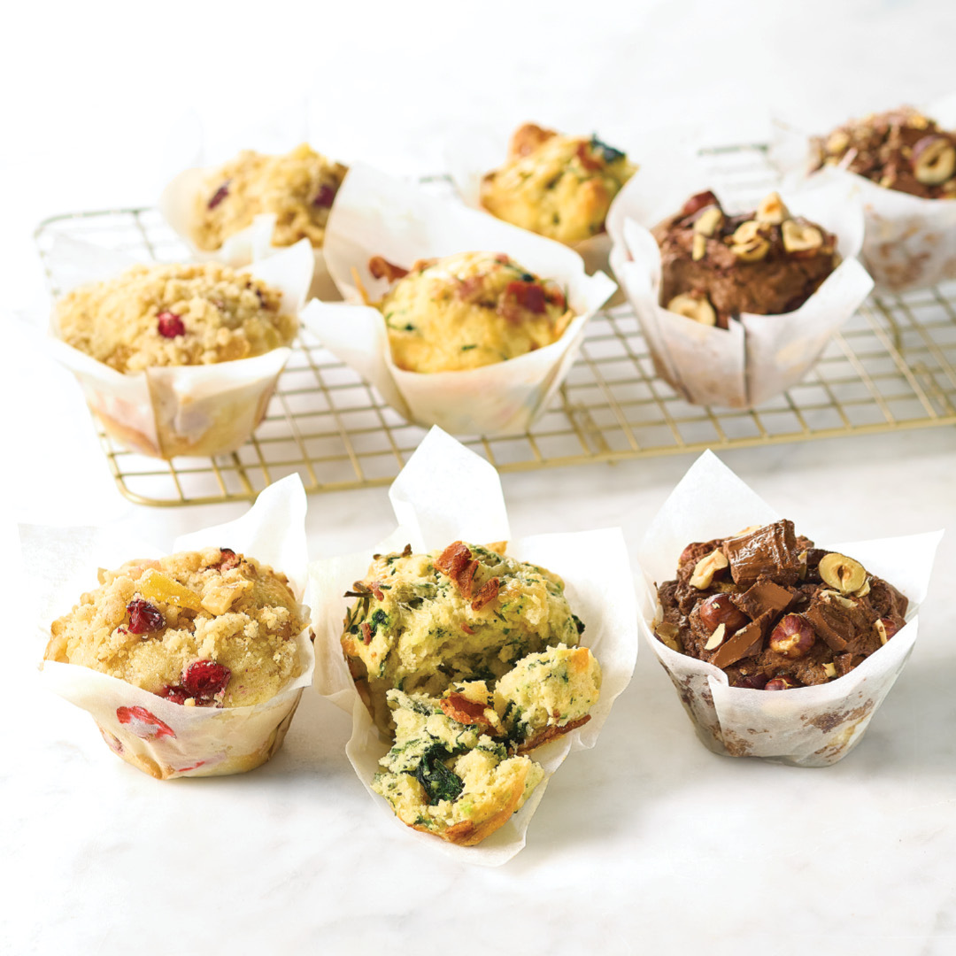 Muffins use a basic mixing method—appropriately named the muffin method—where dry ingredients combine in one bowl, wet ingredients combine in a separate bowl and then the two mixtures get stirred together. Marvel at the sweet and savory flavors of these inspired takes on the basic muffin recipe.
