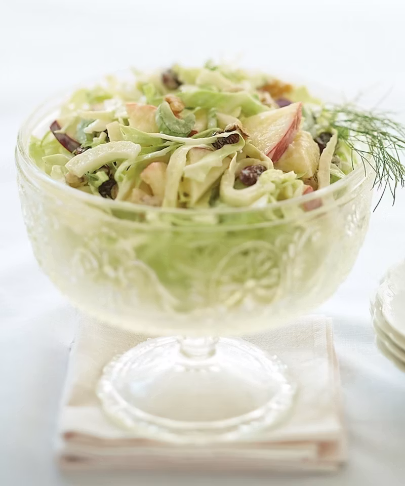 A crisp and flavorful slaw combining cabbage, fennel, apples, celery, walnuts, and raisins, dressed in a sweet and tangy mayonnaise-apple cider vinaigrette.