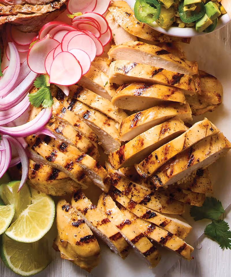 - Remove chicken from marinade; discard marinade. Grill chicken for 16 to 20 minutes or until chicken reaches 165°F. Transfer chicken to cutting board; loosely cover with foil and let rest for 3 minutes. Slice chicken to serve.