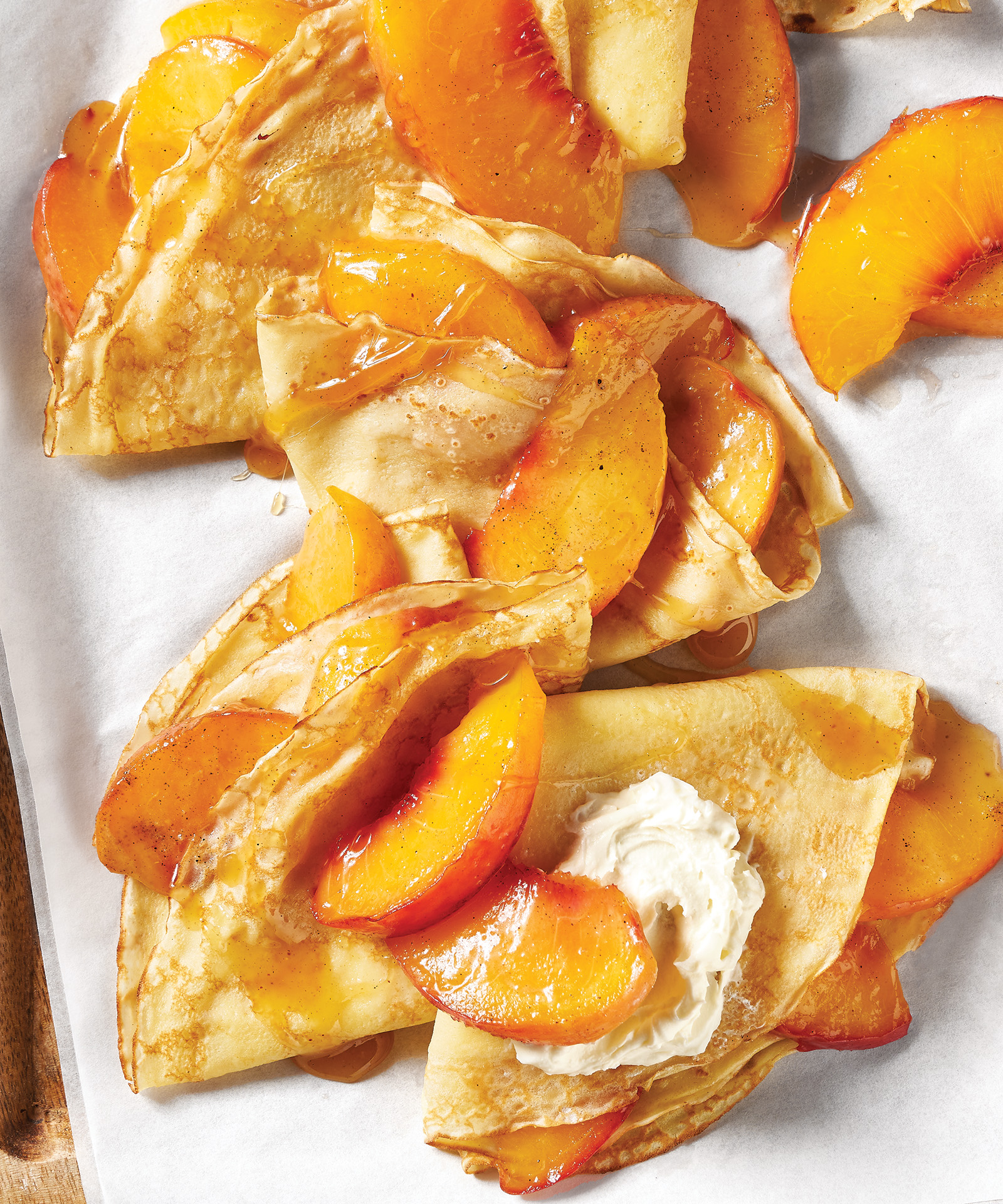 To store leftover crêpes, layer between sheets of waxed paper and place in an airtight storage container. Cover and freeze for up to 1 month. Thaw at room temperature for 1 hour before using. Reheat crêpes in the microwave on HIGH for 20 seconds or until heated through.