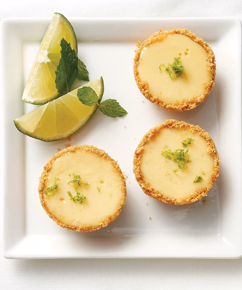 - In a medium bowl whisk together egg yolks, sweetened condensed milk and key lime juice. Spoon filling into baked crusts. Bake for 10 to 15 minutes or until set. Cool in muffin cups on wire rack. Refrigerate at least 3 hours before removing from muffin cups. Garnish with lime zest, if desired.