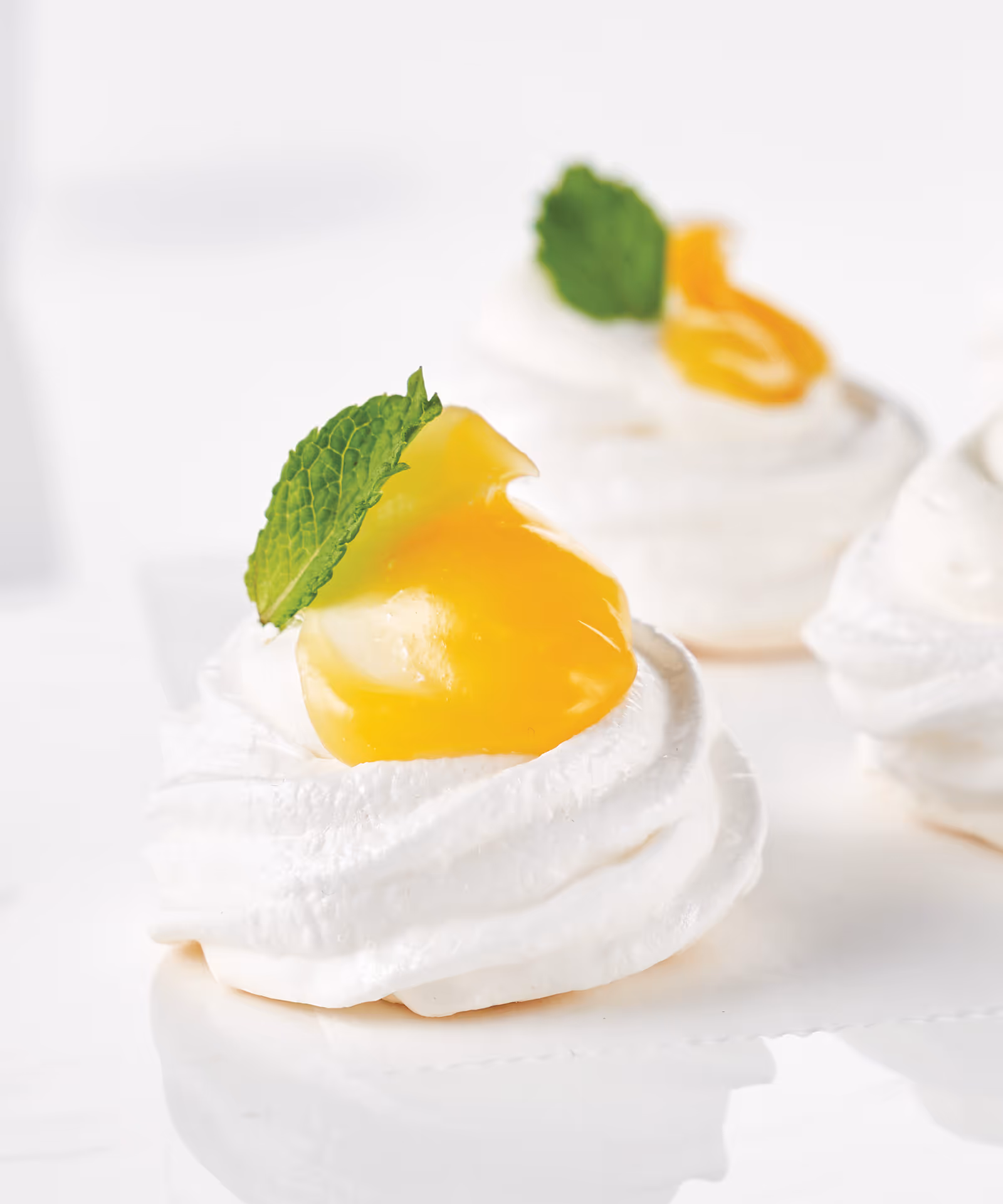 - For topping, in a small bowl beat heavy cream and powdered sugar with mixer on high until stiff peaks form. Spoon 1 teaspoon whipped cream and ½ teaspoon lemon curd on each meringue. If desired, garnish each with a mint leaf.
