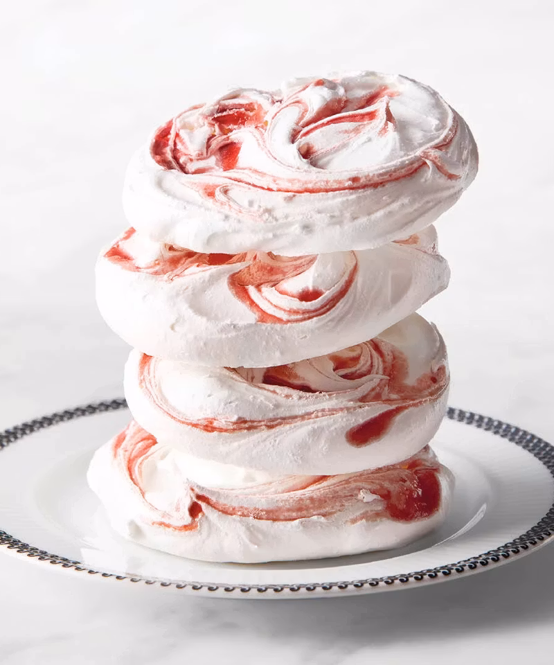 Spoon meringue onto drawn circles on parchment papers, mounding slightly. Gently spoon 1 teaspoon jam on each meringue. Using a toothpick or skewer, gently swirl the jam into the meringues in a decorative pattern.