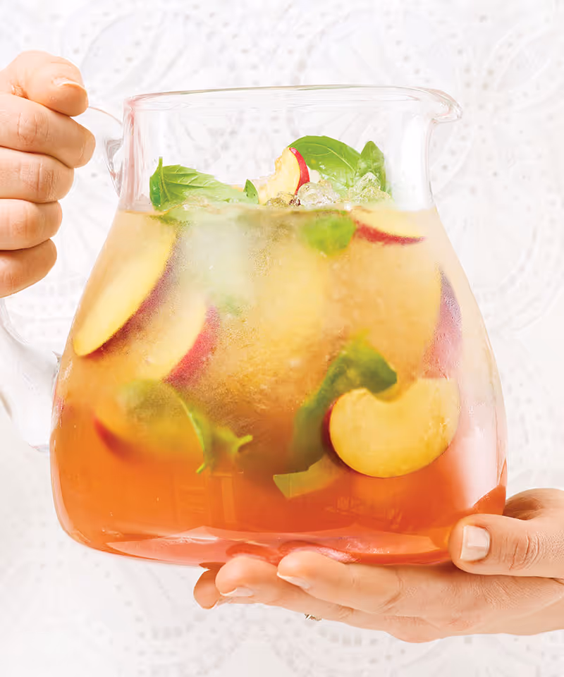 To serve, transfer syrup to a 1½ quart pitcher. Add sparkling water; gently stir to combine. Add ice. Garnish with plum slices and basil, if desired.