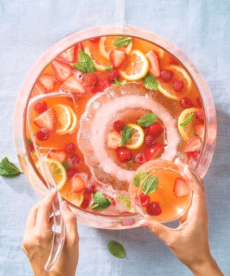 Fresh whole small strawberries, lemon slices, raspberries and/or fresh mint, for garnish