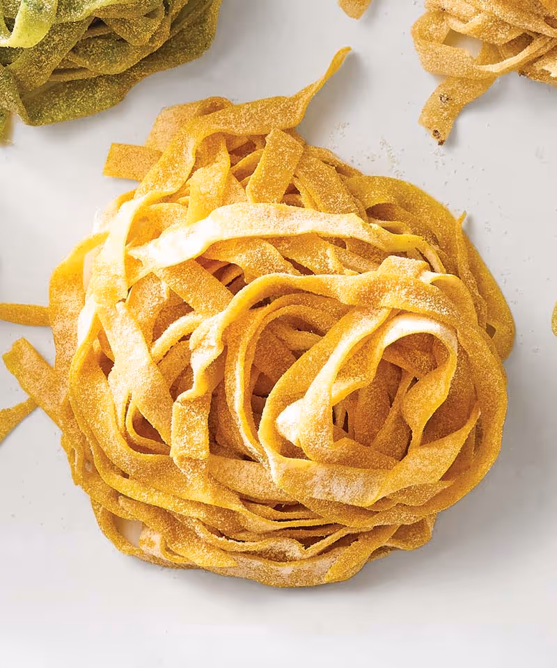 Homemade ribbon-like tagliolini colored with golden turmeric, offering a fragrant, visually striking pasta ideal for light or bold sauces.