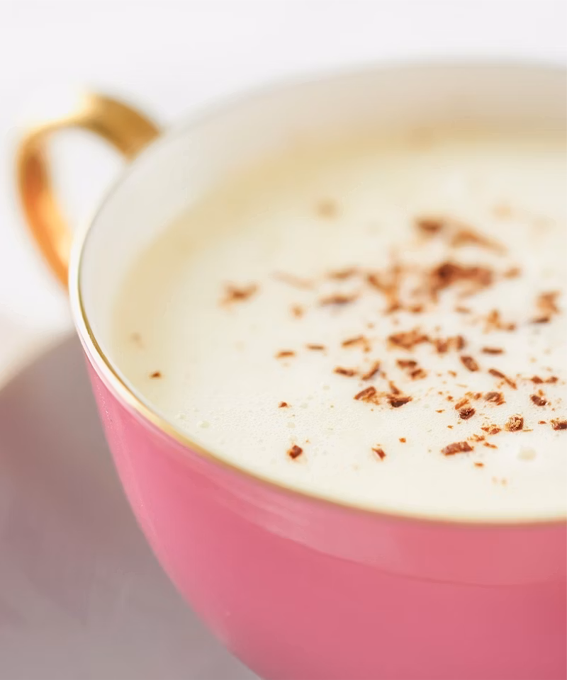 Rich and frothy white hot chocolate with vanilla and peppermint, served warm and finished with a sprinkle of dark chocolate for a cozy treat.